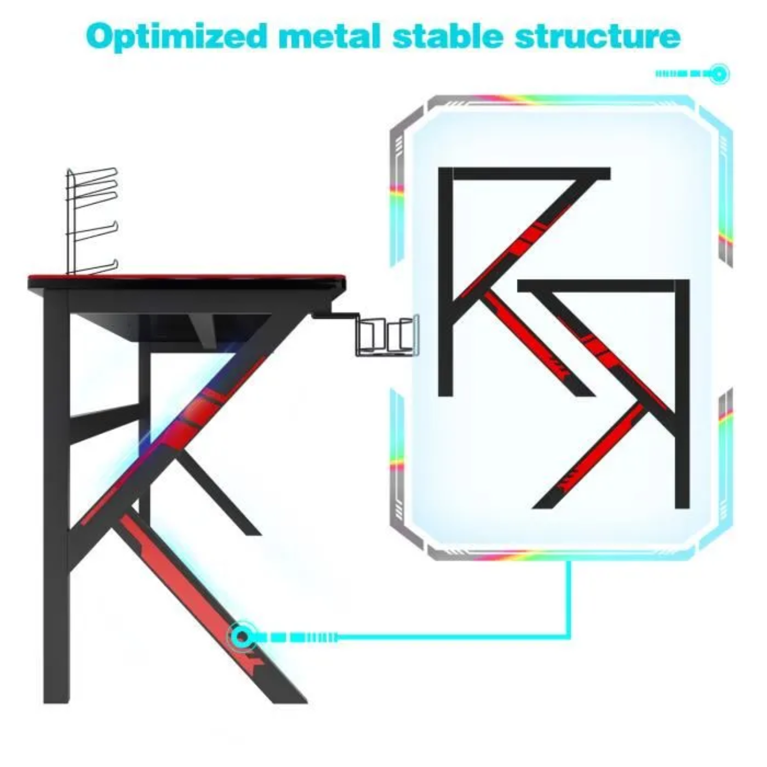 La table de jeu est équipée de trous de gestion des câbles, qui maintiendront tous les câbles en ordre. L’assemblage du support de chargement USB, du porte-gobelet à eau et du crochet pour casque peut vous offrir un confort en dehors du jeu!