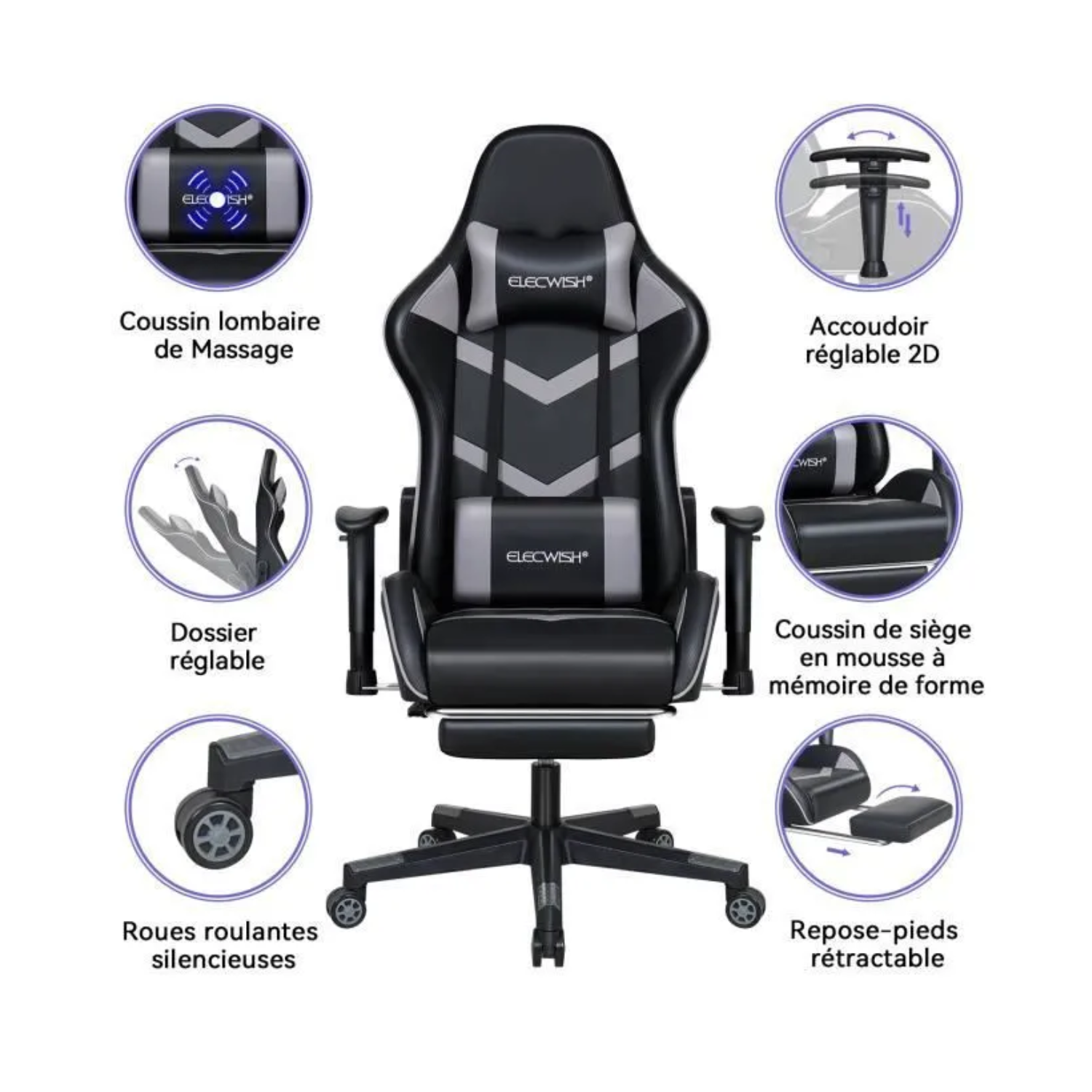 • Pieds cinq étoiles : Le fauteuil inclinable de jeu de haute qualité adopte un matériau en alliage à cinq griffes pour une durée de vie plus longue et une sécurité accrue.
