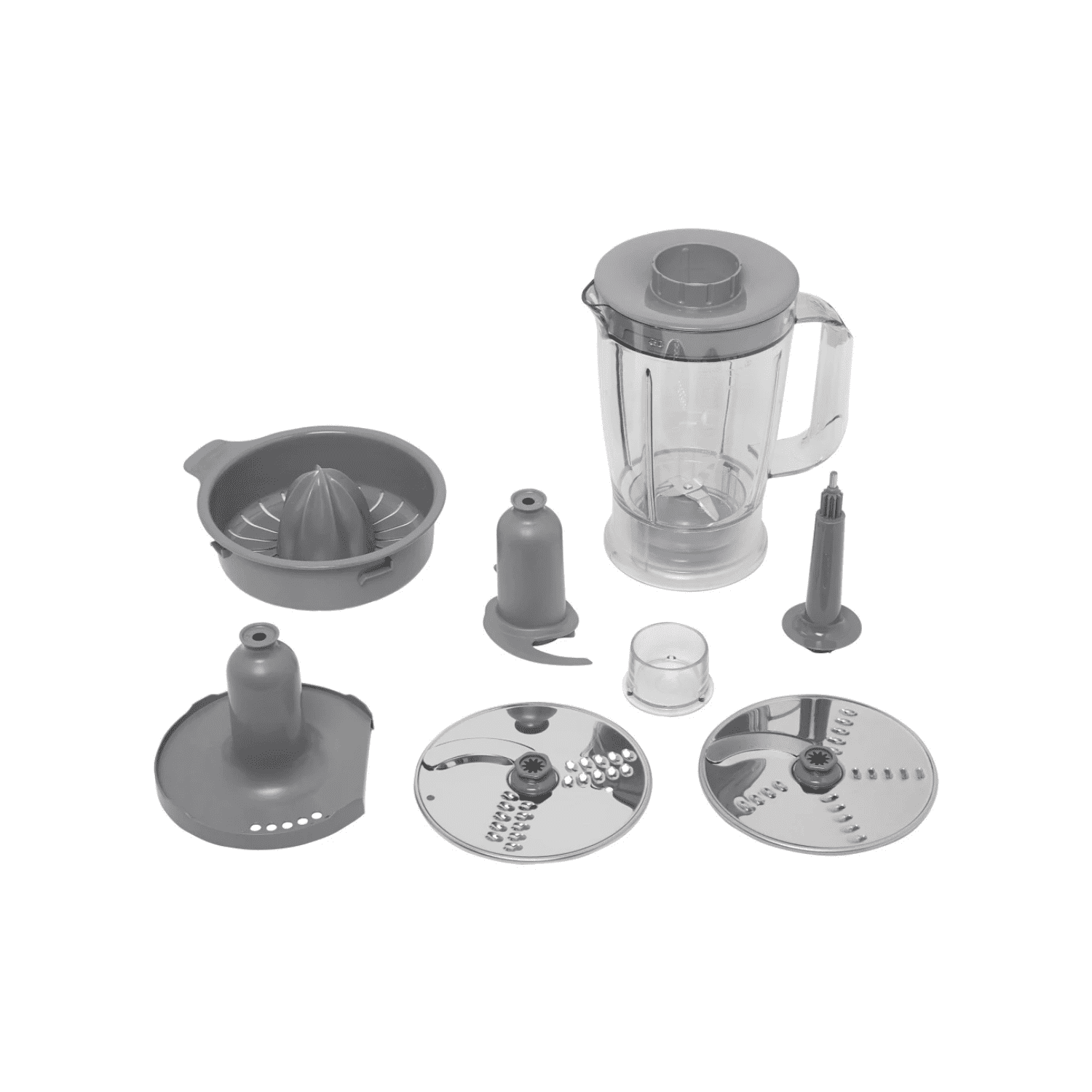 Livré avec : blender, emulsionneur, presse-agrumes, rapeur/Eminceur, rapeur/Trancheur, spatule